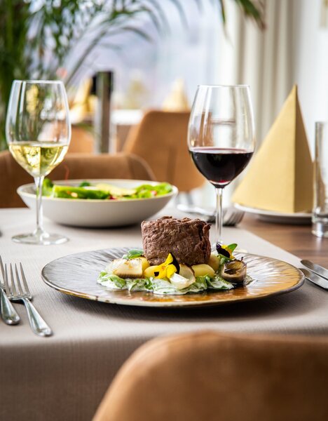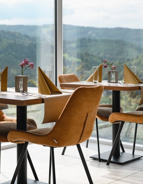 The Panorama Restaurant is located on the 8th floor and offers beautiful views of the Silesian Beskids. Here, breakfasts and dinner buffets are served in the form of a rich and varied buffet with special dishes for children, vegans, vegetarians, and people with lactose intolerance.